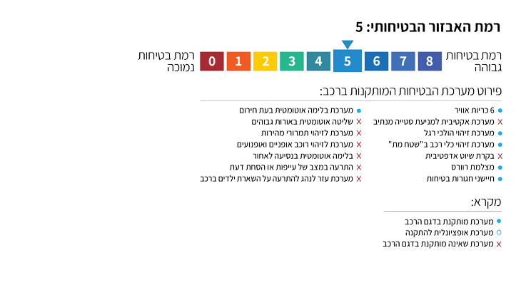חבילת הבטיחות מתחילה עם בלימת חירום אוטונומית, ניטור שטחים מתים והתראה על תנועה חוצה מאחור. יש גם יכולת לזהות ולכי רגל ולבלום במידת הצורך עוד תמצאו חיישן אורות אוטומטי ואפילו ניטור לחץ האוויר בצמיגים. בנוסף, יש גם בקרת יציבות ובקרת אחיזה, הגבלת מהירות במורד תלול בשטח כמו גם 7 כריות אוויר.